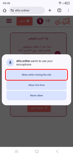 در ابتدای آزمون برای تست میکروفون، باید روی جعبه کنترل صدا کلیک کنید؛ پس از کلیک، مرورگر Chrome از شما درخواست دسترسی میکروفون خواهد کرد. برای اجازه دادن بدینصورت عمل کنید: